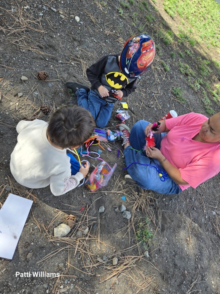 Denicka has been doing class activities around farming . While outside on Friday, we attempted to build a house with rocks and pine cones. Today I brought out bulk craft items ( feathers , popsicle sticks, pom poms, pipe cleaners) and let the children 0penly do whatever with them.