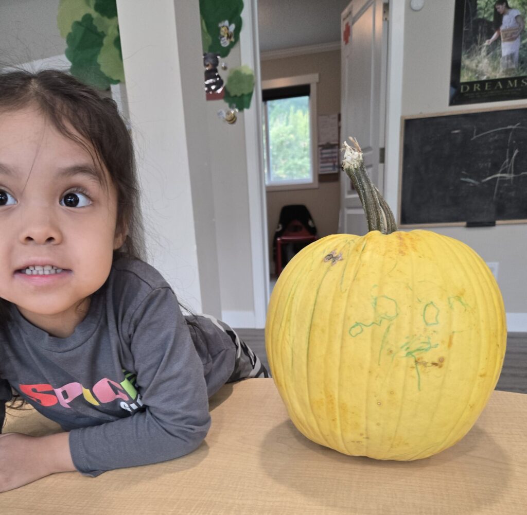 Here is Miss. O. She was always excited to try something new. I had out at the table was washable markers , medium pumpkin, and baby wipes. I gave no instruction and just watched Miss. O draw. She has great arm, hand , and eye co-ordination. I asked her what did you draw? Miss. O said “I drew my family . She enjoys making art about her family, for her family.