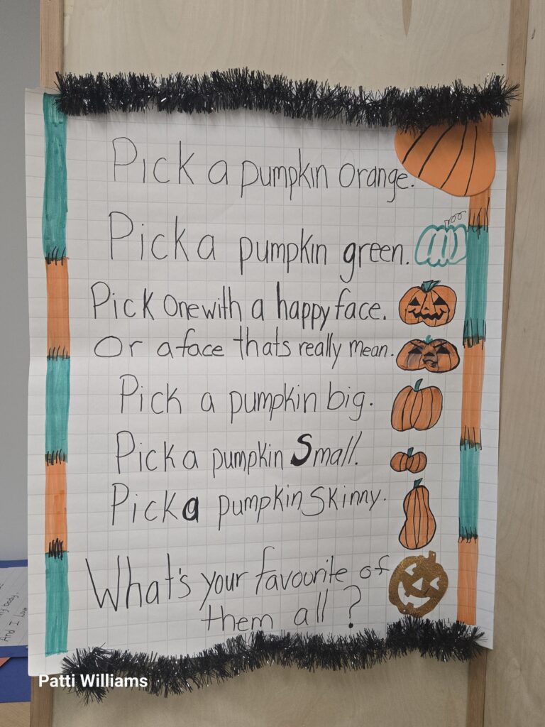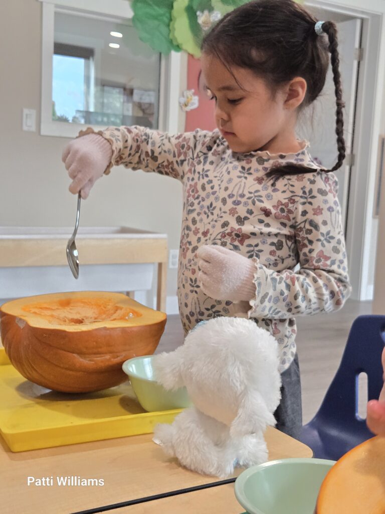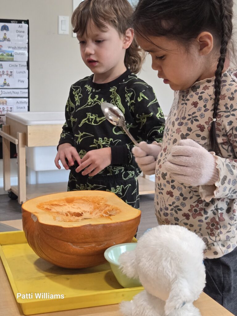 Next time I would like to try asking the children to bring a tool from home to scoop out their pumpkin pulp. Maybe if the children bring something from home will give them more initiative. Maybe Olivia you bringing your favorite tool will have you in less fear of getting messy.