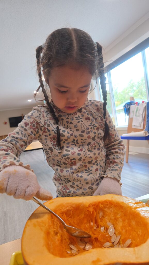 Olivia I did not know that you were excited to do this pumpkin pulp removal until I heard you state “Let’s do this!”. Was it Lennox uplifting spoon reflection observation that gave you the courage to touch the pulp? Or was it the gloves that give you the strength and comfort to confront your fear of the pumpkin goo? Next time Olivia I’ll make sure that all the children be given gloves and wear paint schmock . I hope providing these aids that it will ease your sensory anxieties so we can further your explorations on pumpkins in the future.