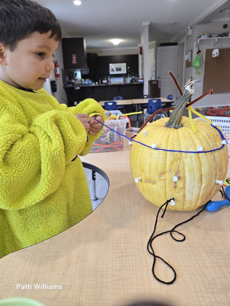 Leeland, you are so good and swift at being crafty. You finished fast, so you could go play in the center’s yard, which was fine. I also enjoy playing with the children just as much as crafting. Yet when we brought our pumpkins inside, Leeland, you tied wool and pipe cleaners around the tee. Was a pleasure to watch you explore with the pumpkin.