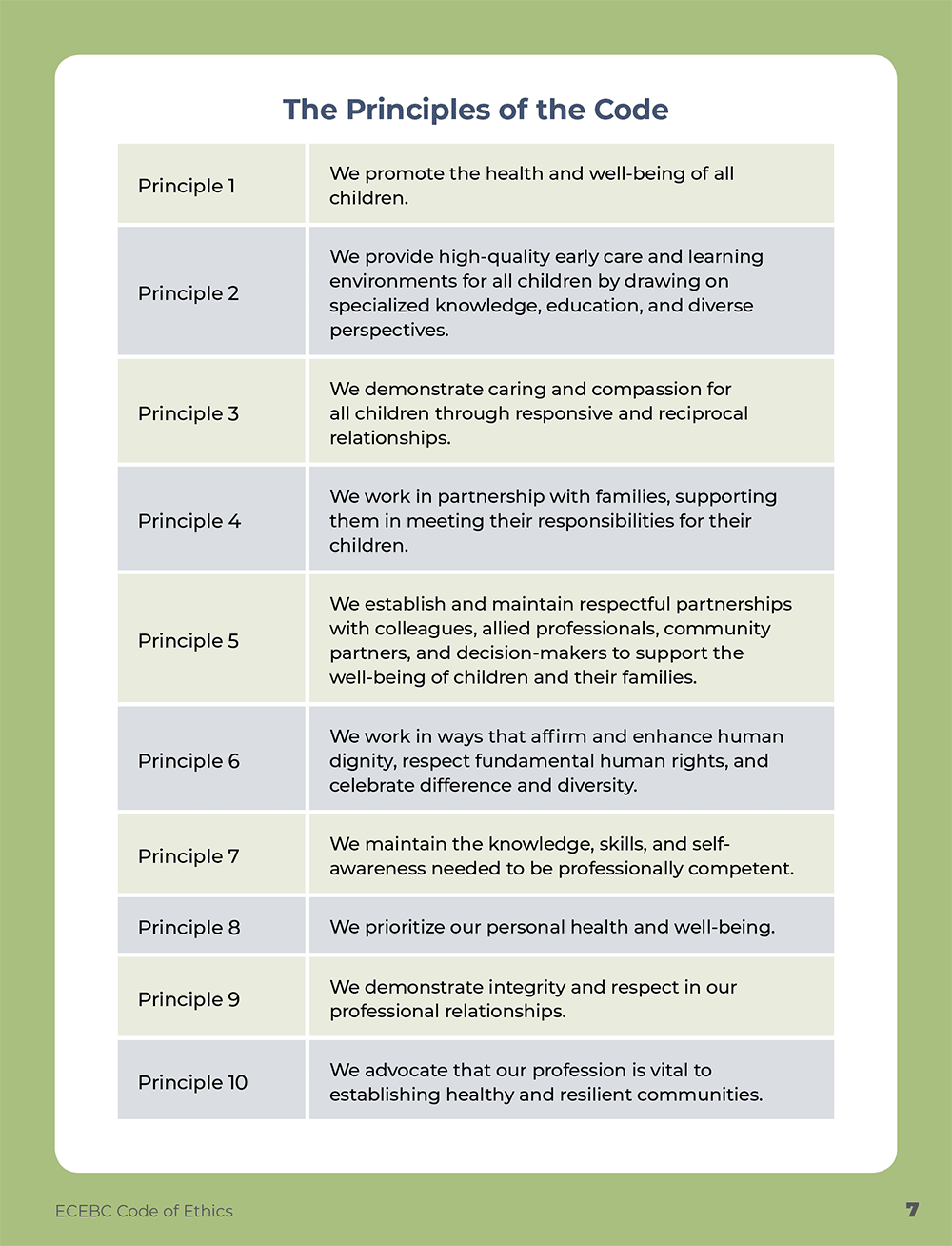 - Engage in ongoing reflection of personal practice and to demonstrate the personal and professional attributes related to the conduct and professional communication as guided by the ECEBC Code of Ethics and the TRU ECE program.